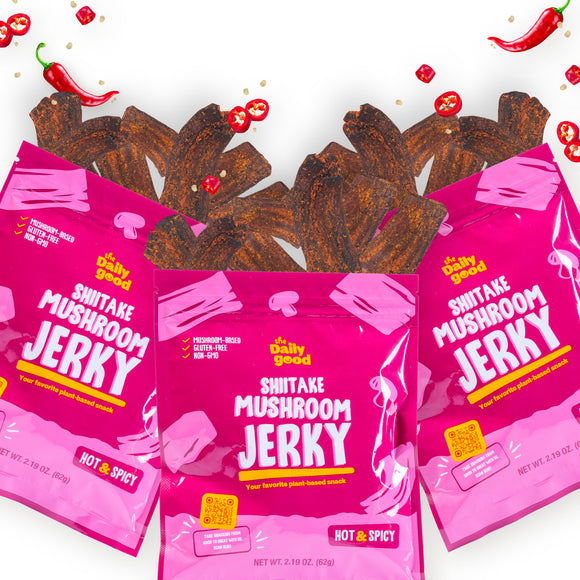You can find mushroom jerky in stores or try The Daily Goods Mushroom Jerky for a delicious, plant-based option packed with umami flavor.