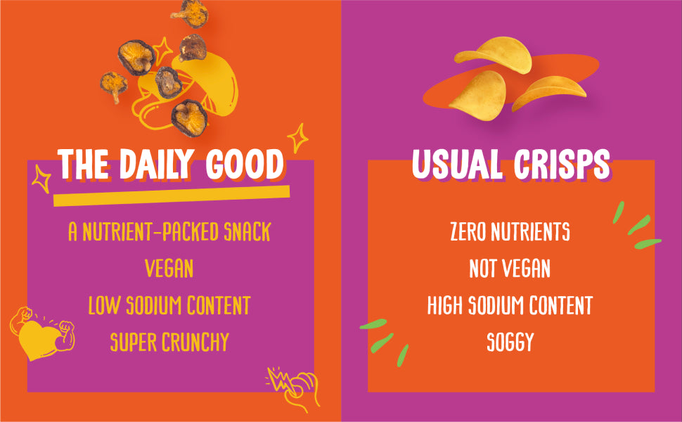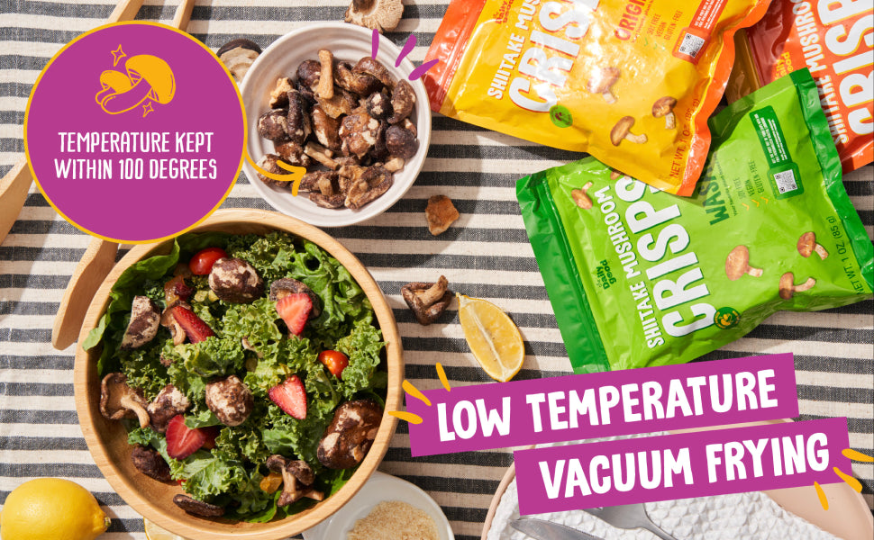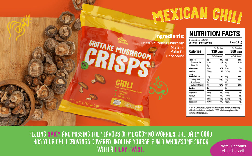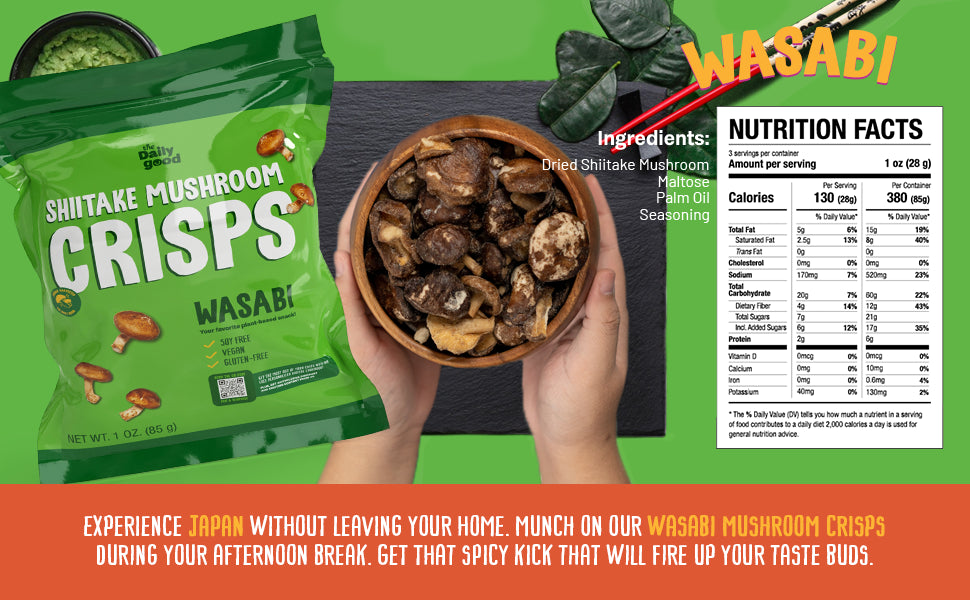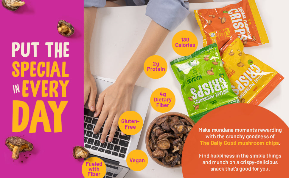 Have some chips every day, your way. This mushroom snack is available in original, Mexican Chili, and Wasabi flavors. Whether you’re having a Sunday downtime or hosting a small party with friends, these dried mushrooms shitake crisps will be a crowd-favorite snack. Get your fix of satisfying crunch and flavor that will leave you wanting more. Feeling creative? Then add a healthy crunch to your favorite dishes. Just sprinkle some of our shitake mushrooms dried to your pasta or salad. The delicious possibilities are aplenty. Go on. Indulge. It’s good for you.