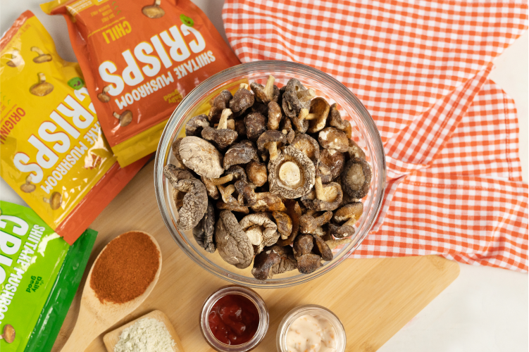 The best way to keep these mushroom snacks fresh is to store them in a cool, dry place like your pantry or kitchen cupboard. You can also take them out of their packaging and store in airtight containers to maintain the mushrooms’ crispiness.